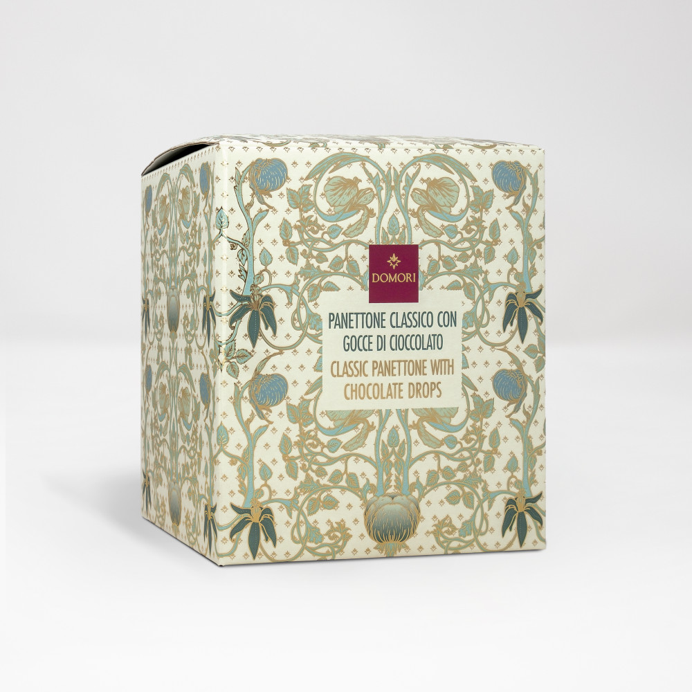 The Domori Panettone in its classic version. The dough is made with natural yeast and is enriched with dark chocolate drops and candied orange peel.