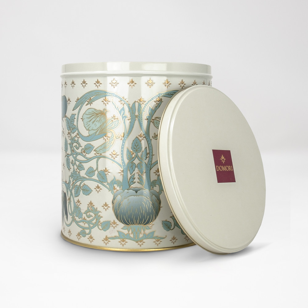 The Domori Panettone in its classic version. The natural yeast dough is enhanced with dark chocolate drops and candied orange peel. Reusable tin box.
