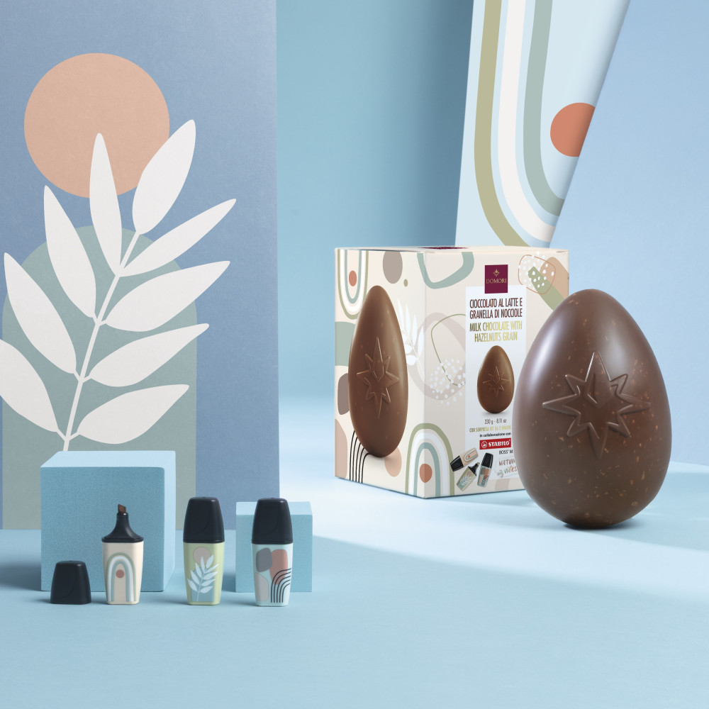 Experience a perfect blend of creamy milk chocolate and crunchy hazelnuts in an egg with a rich, enveloping taste. Contains 3 Stabilo Nature Vibes miniature highlighters.