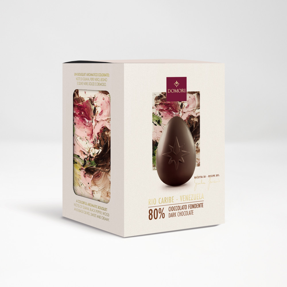 80% dark chocolate egg from the “Uova Fondenti d'autore - Gianluca Franzoni” line, a collection that celebrates the art of dark chocolate as an authentic expression of the founder. Each creation holds a rich and elegant bouquet, born from the passionate search for aromatic and prized cocoas. The packaging, which is a work ofart, translates the aromatic profile of the eggs into shapes and colours, transforming the eating process into both an aesthetic and a tasting experience.