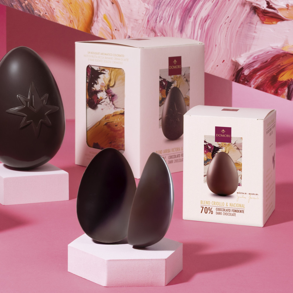 70% dark chocolate egg from the “Uova Fondenti d'autore - Gianluca Franzoni” line, a collection that celebrates the art of dark chocolate as an authentic expression of the founder. Each creation holds a rich and elegant bouquet, born from the passionate search for aromatic and prized cocoas. The packaging, which is a work ofart, translates the aromatic profile of the eggs into shapes and colours, transforming the eating process into both an aesthetic and a tasting experience.