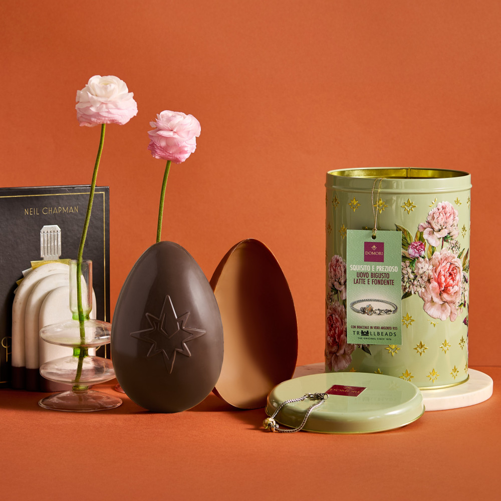 Dual-flavour egg made with 70% dark chocolate and 38% milk chocolate presented in a tin box. Contains a silver 925 wristband with a different-coloured bead.