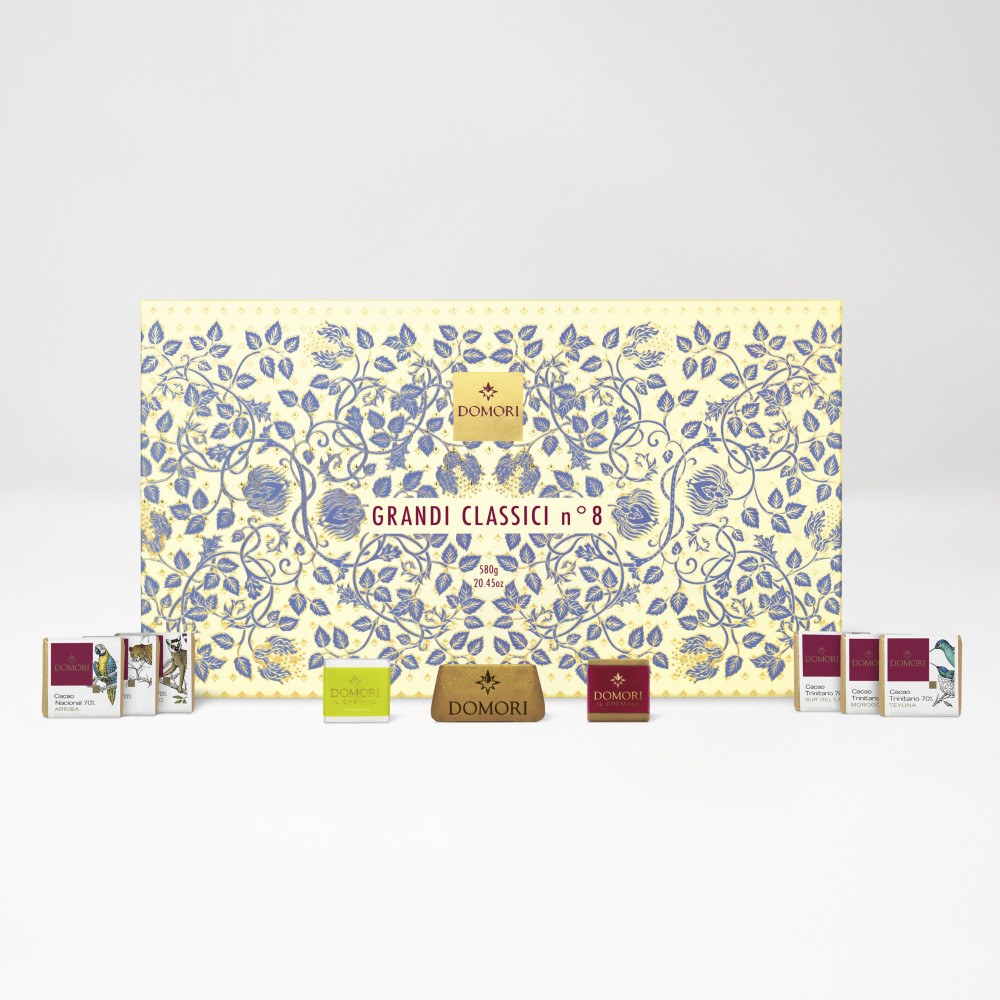 Precious and elegant box that contains some of the most popular sweet specialties of Turin. The package contains Criollo giandujotti, classic and pistachio cremini, napolitains single origins.