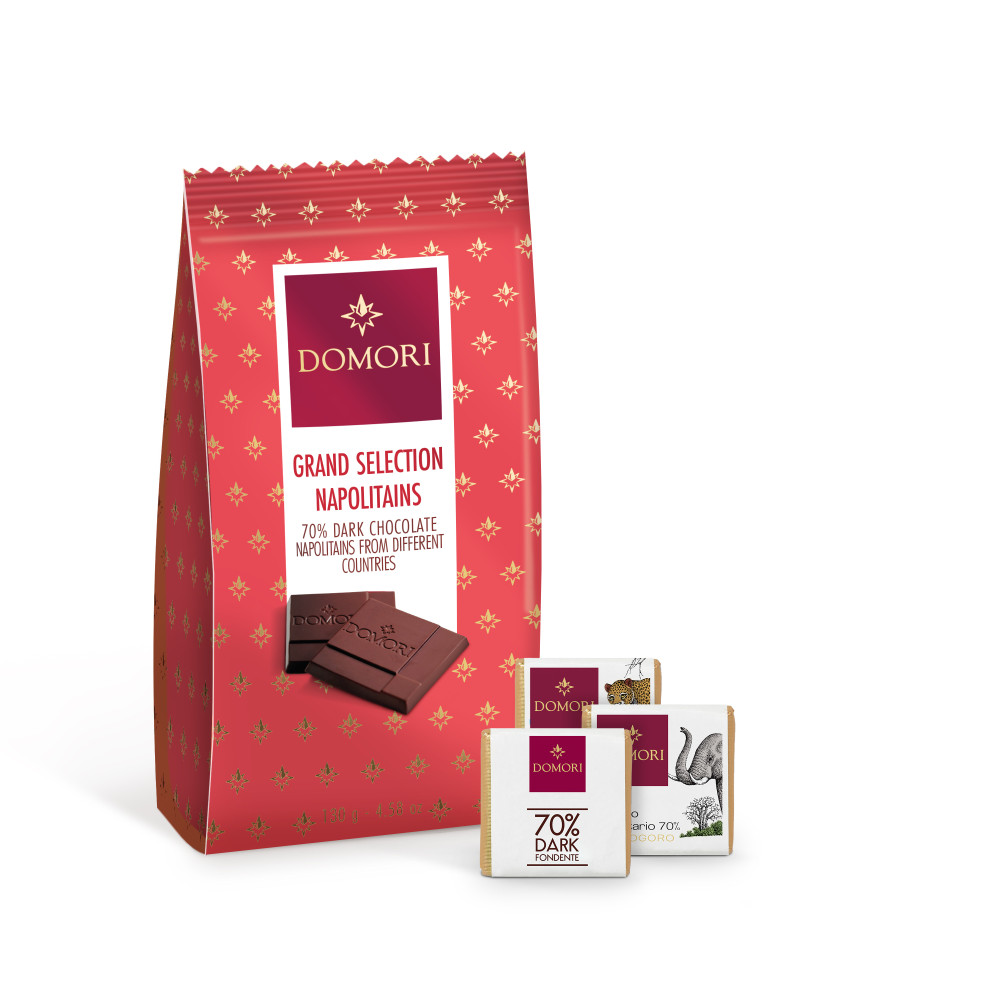 A 130g pouch filled with assorted dark chocolate napolitains, perfect to carry with you or as a small gift.
