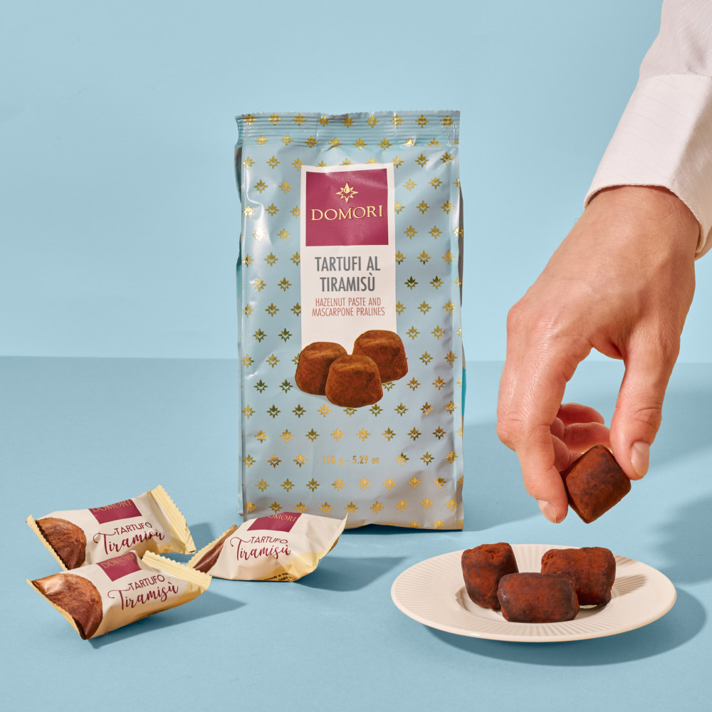 A 150g pouch filled with tiramisù truffles, perfect to carry with you or as a small gift.
