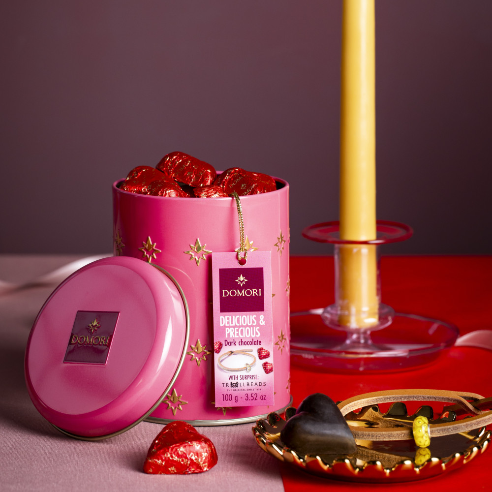 A reusable collector’s tin containing Cuor di Criollo chocolates. Contains a different coloured Trollbeads leather wrist band and bead.