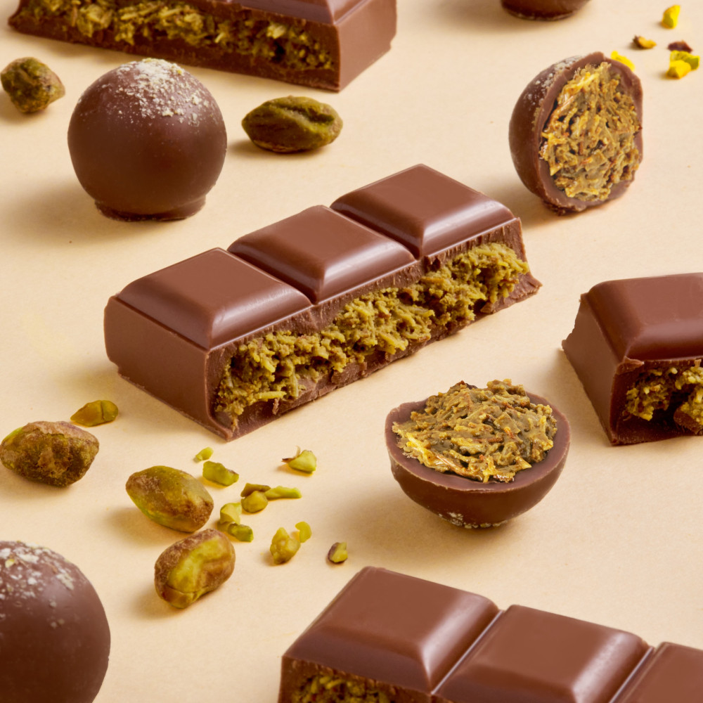 Ingredients: Milk Chocolate 55% (Cane Sugar, Cocoa Butter, Milk Powder, Cocoa Mass, Emulsifier: Soya Lecithin), Pistachio Paste 29%, White chocolate (Sugar, Cocoa Butter, Milk Powder, Emulsifier: Soya lecithin, Natural Vanilla Flavour), Kadayif 3% (Wheat Flour, Water), Pistachio 1%, Sea Salt. Milk chocolate contains cocoa solids 38% minimum and milk solids 24% minimum. White chocolate contains cocoa solids 28% minimum and milk solids 22% minimum.