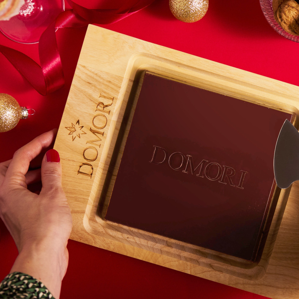 A maxi bar of dark chocolate Tanzania 68%, a wooden cutting board and a knife for sculpting and cutting the chocolate. An original mix for a great gift idea!