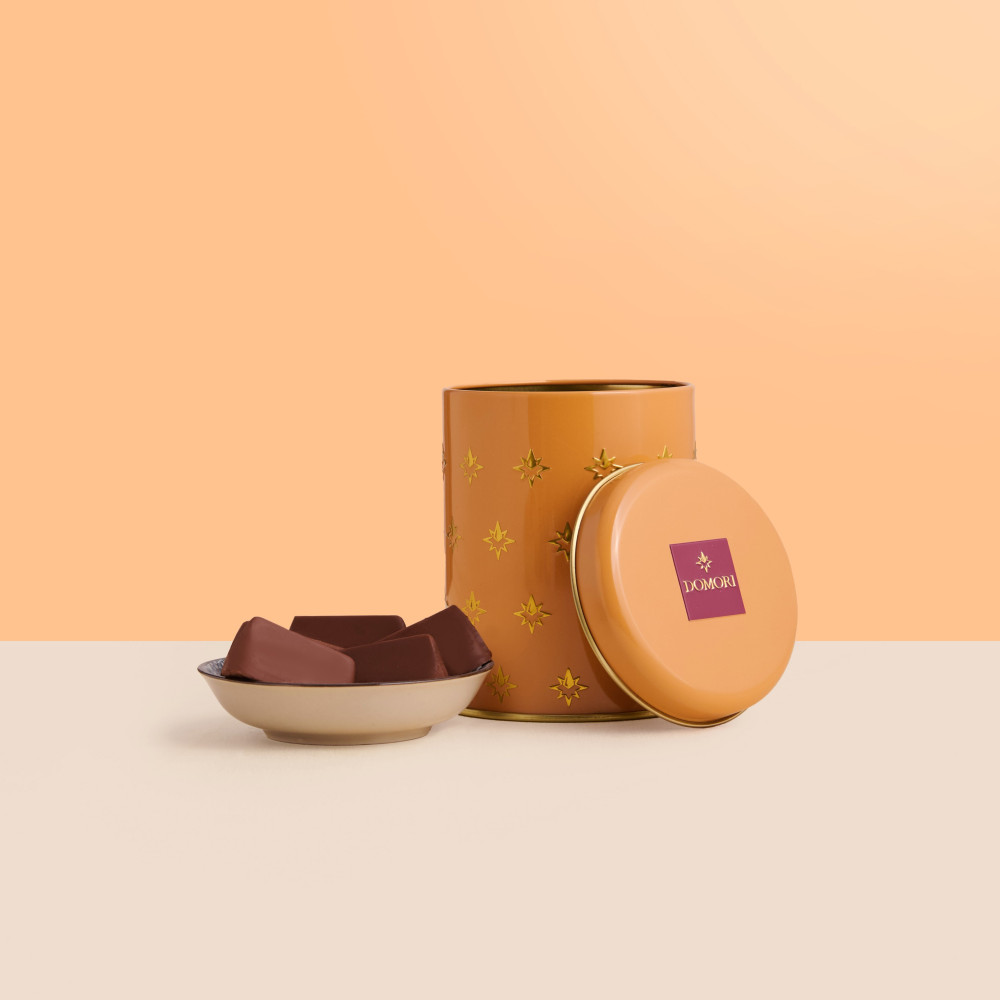 Confezione regalo in metallo da collezione contenente i giandujotti classici reinventati da Domori utilizzando cacao fine e Nocciole Piemonte IGP.
