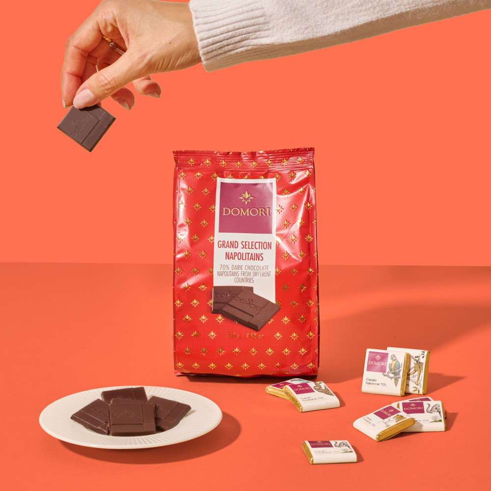 Sacchetto da 130g di napolitains fondenti assortiti da portare con sé o come piccolo cadeau.