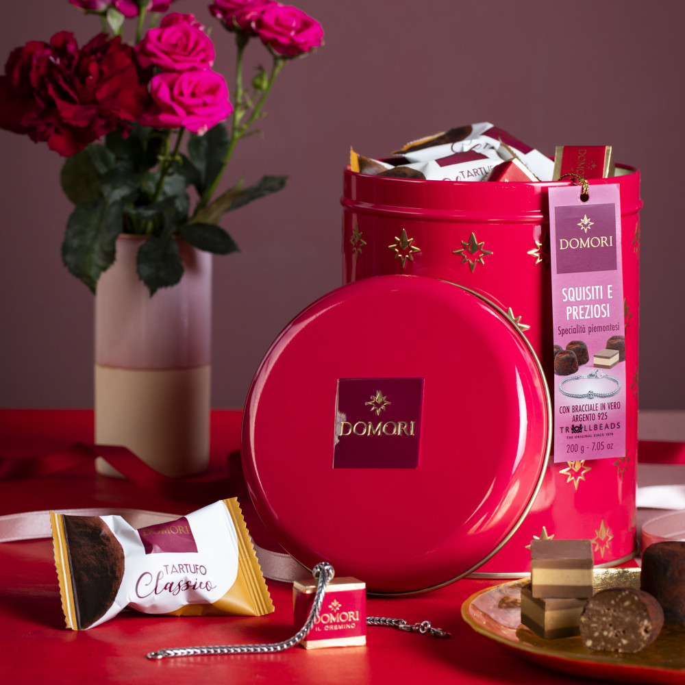 Confezione in metallo da collezione riutilizzabile contenente tartufi classici e cremini classici. All'interno, un bracciale Trollbeads in argento 925.