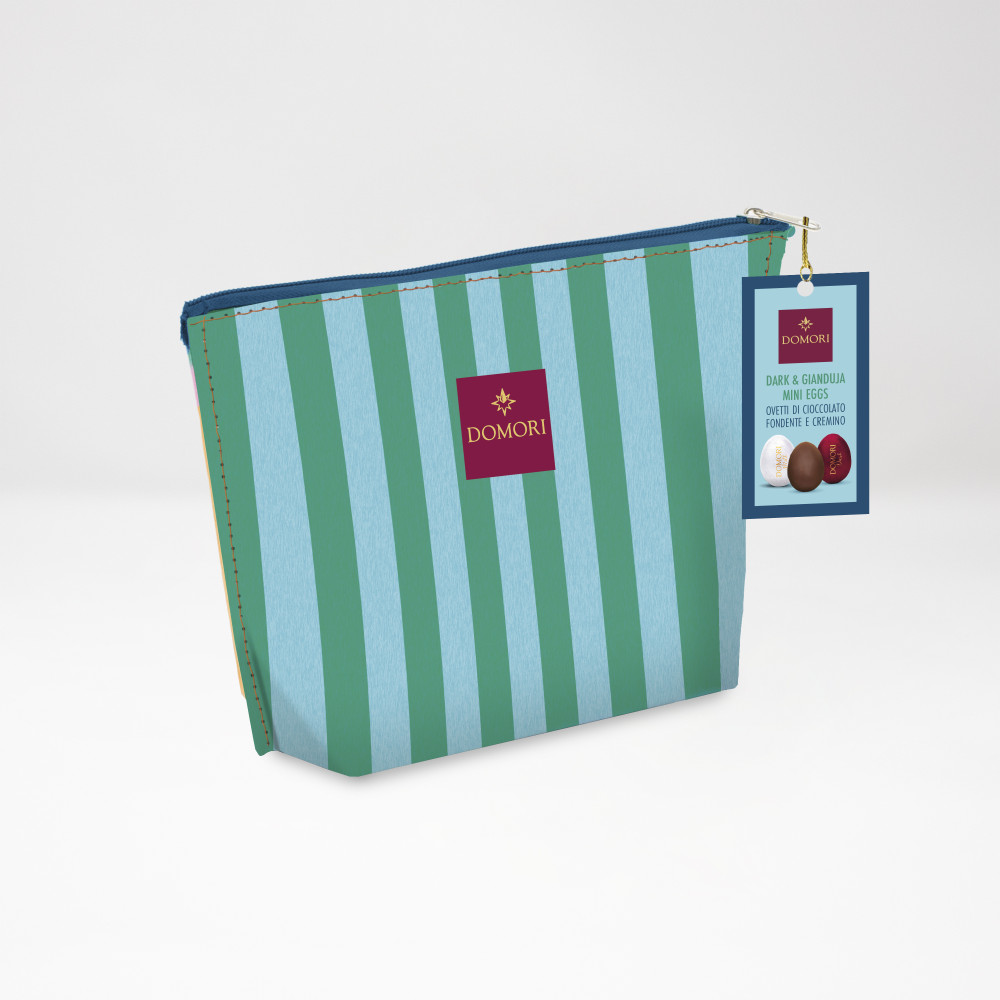 Pochette riutilizzabile in carta color verde e azzurro contentente ovetti di cioccolato fondente con ripieno di nocciola e cioccolato al latte con ripieno di gianduja.